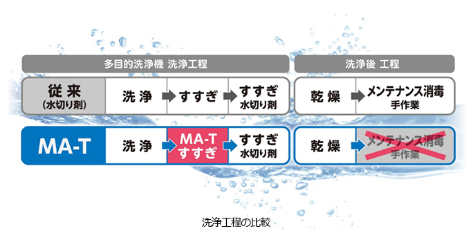 革新的酸化制御技術「MA-T®」をすすぎ水として活用し、すすぎと消毒を同時に行うことで、作業者の負担になっていた「手作業による拭き上げ消毒」を機械による「すすぎ」だけで完結、メンテナンスの手間を大幅に削減できることが期待されます。